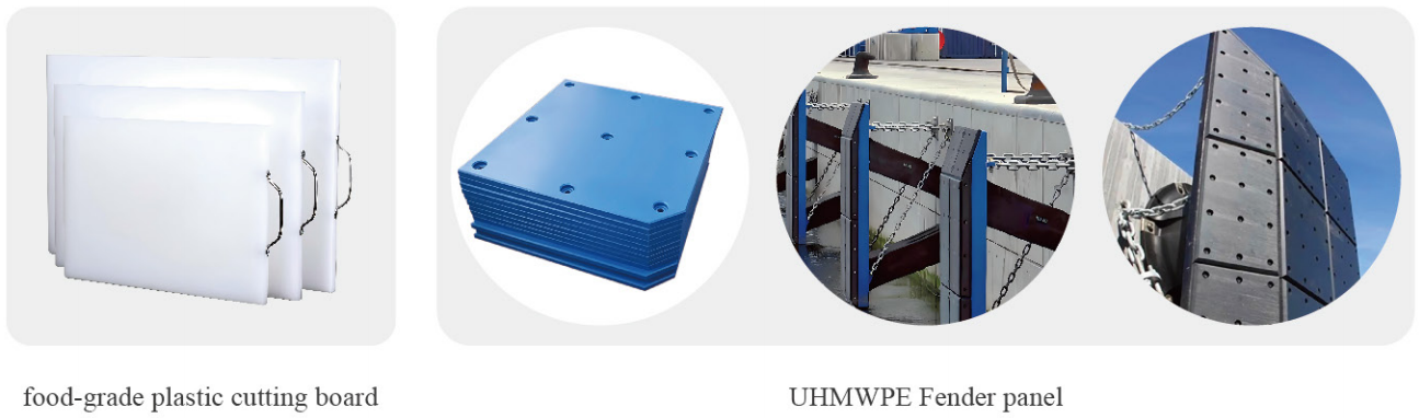 It can be widely used in anti-impact, abrasion-resistant, corosion-resistant, non-adhesive and demanding industrial miningfields, such as textile machinery, beverage and food machinery and water treatment and other industries, The hygienic, non-toxicand non-deforming characteristics of UHMWpE sheet can be used to make food-grade plastie cuting boards, It is also used inharbour terminals, such as fender panels, which can prevent damage caused by the impact of ships and terminals.